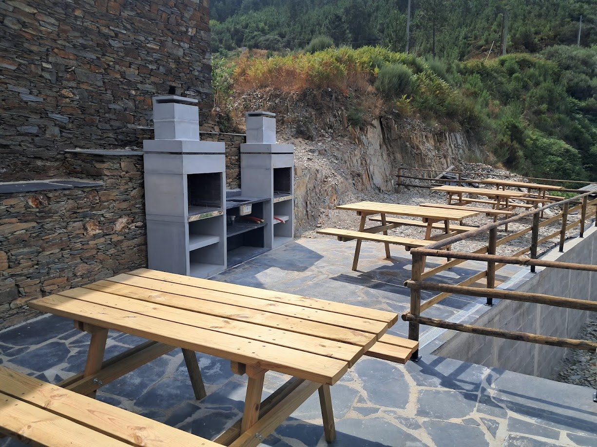 Espaço exterior com churrasqueiras e zona de estar.